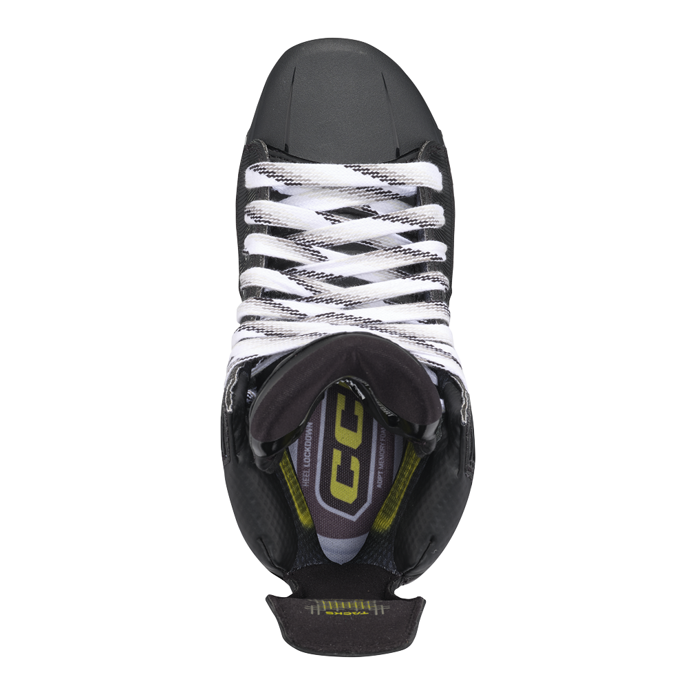 Внутреннее наполнение: Используемый в топовой модели высокоэффективный и влагоотводящий материал TOTALDRI PRO сохраняет ноги сухими, а коньки лёгкими. Отзывчивая пена, обработанная по технологии POLYGIENE, облегает ноги по всей внутренней поверхности ботинка, обеспечивая комфорт и превосходную защиту от запаха и бактерий. Многослойная конструкция с более плотной пеной с эффектом памяти ADАPT обеспечивает максимальный комфорт и более плотную посадку премиум-качества в зоне лодыжки, а также более узкую зону фиксации пятки, что обеспечивает надежную фиксацию ноги при каждом движении. Продвинутая и невероятно легкая стелька CCM ORTHOLITE ULTRA удобно поддерживает стопу и делает посадку более комфортной.