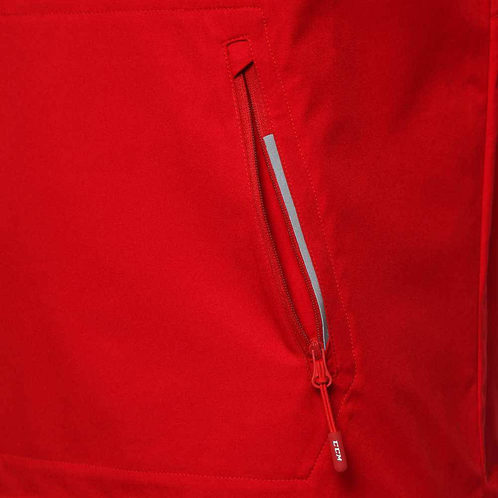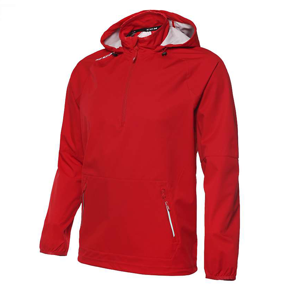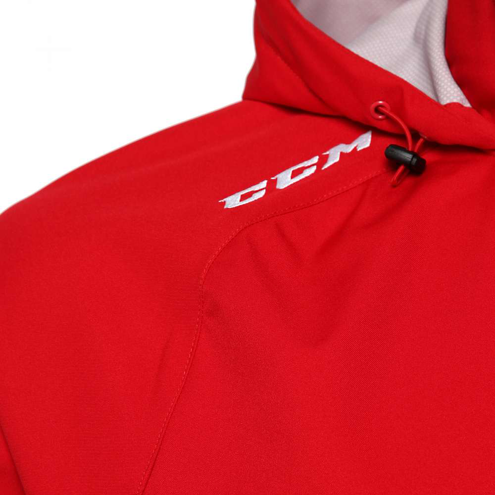 Спереди находится основная молния в ¼ длины, регулировка капюшона, карман кенгуру на молнии со светоотражающими декоративными вставками и логотип CCM. В области подмышек предусмотрены специальные надрезы лазером, способные эффективно отводить излишки тепла. Материал куртки отталкивает влагу и имеет антистатическую обработку. Рукава с эластичными манжетами и подол куртки обладает удобной регулировкой.