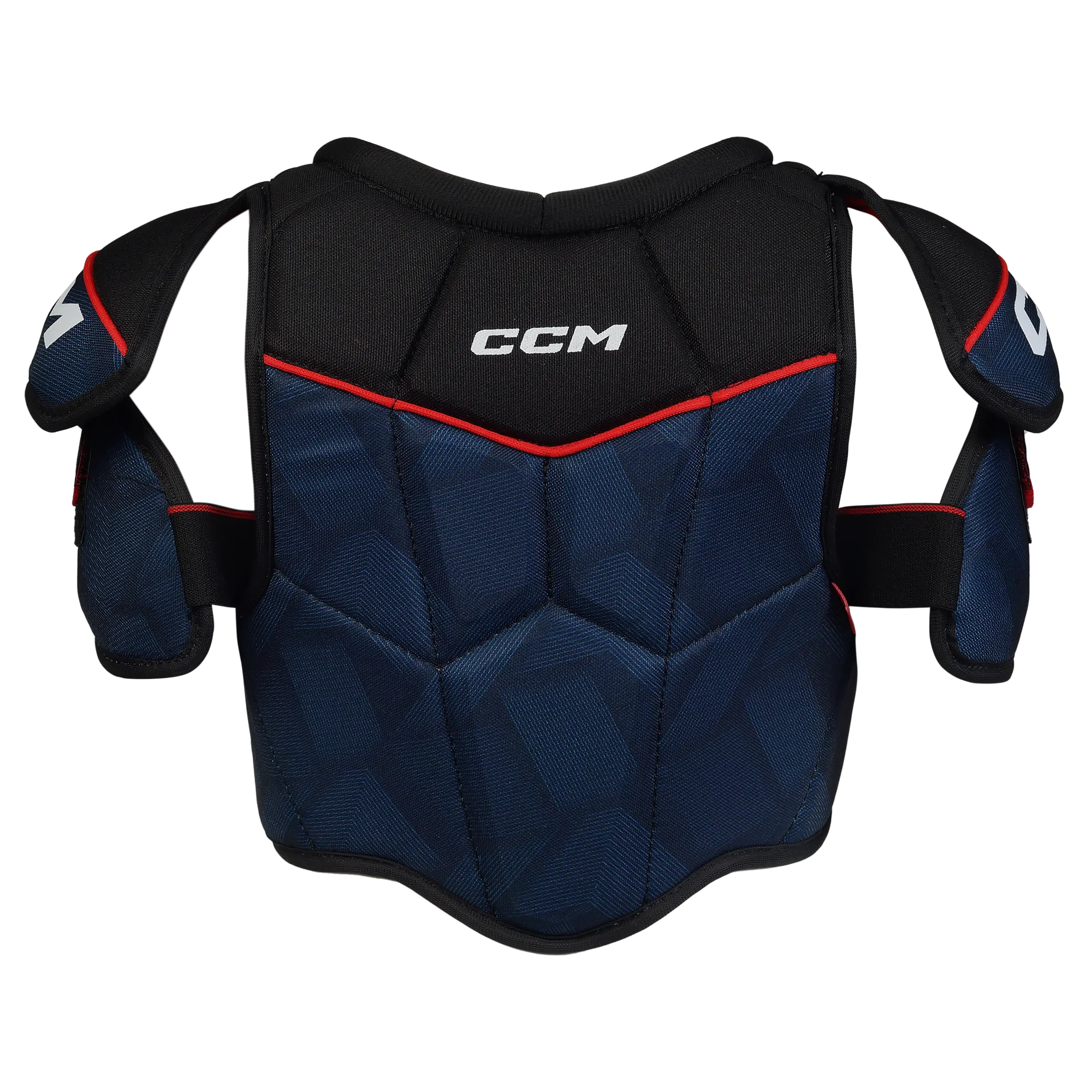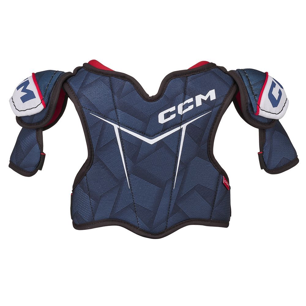 Формованные пластиковые плечевые чашки полностью покрывают плечевой сустав, оберегая его от ударов клюшкой или падения на лед.