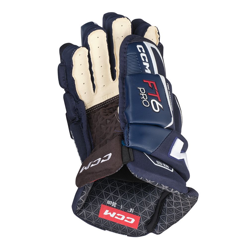 Ладошка перчатки: обновленная ладошка перчатки Jetspeed FT6 Pro представляет из себя комбинацию из уже хорошо известного материала PRO CLARINO и абсолютно нового материала SENSALAST с рельефной текстурой. Эта сочетание обеспечивает не только долговечность перчаток, но и хорошее сцепление с клюшкой. Бесшовный переход от манжеты к ладони создан для максимально комфортной игры.